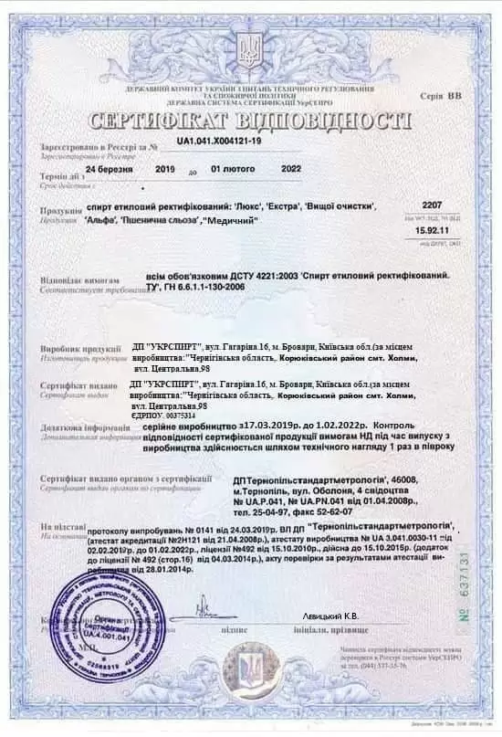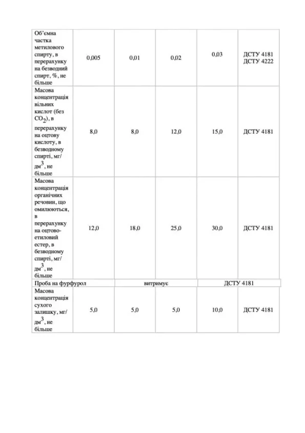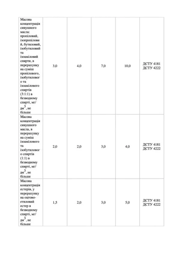 | Масова концентрація сивушних олій у перерахунку на безводний спирт | не більше 2,0 мг/дм³ |