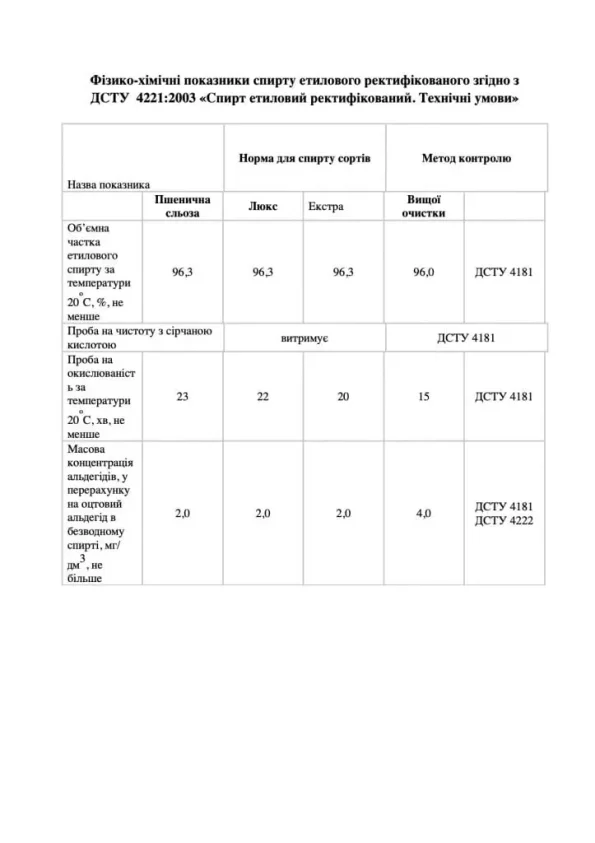 | Відсотковий вміст етилового спирту | не менше 96,3% |